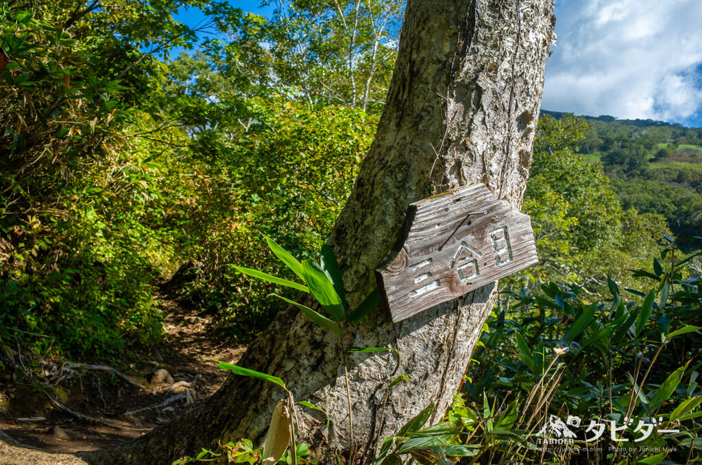 山小屋の分岐を過ぎると「山頂」という標識を見て「もう着いたじゃん!」と一瞬喜んだが、山頂を示す看板だった……。さらに登る……。