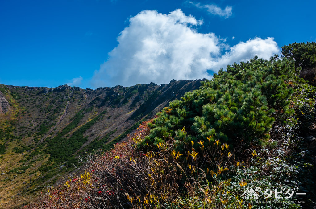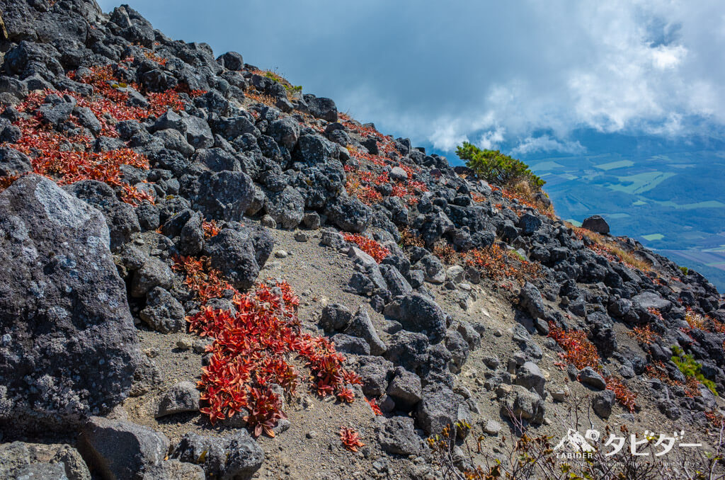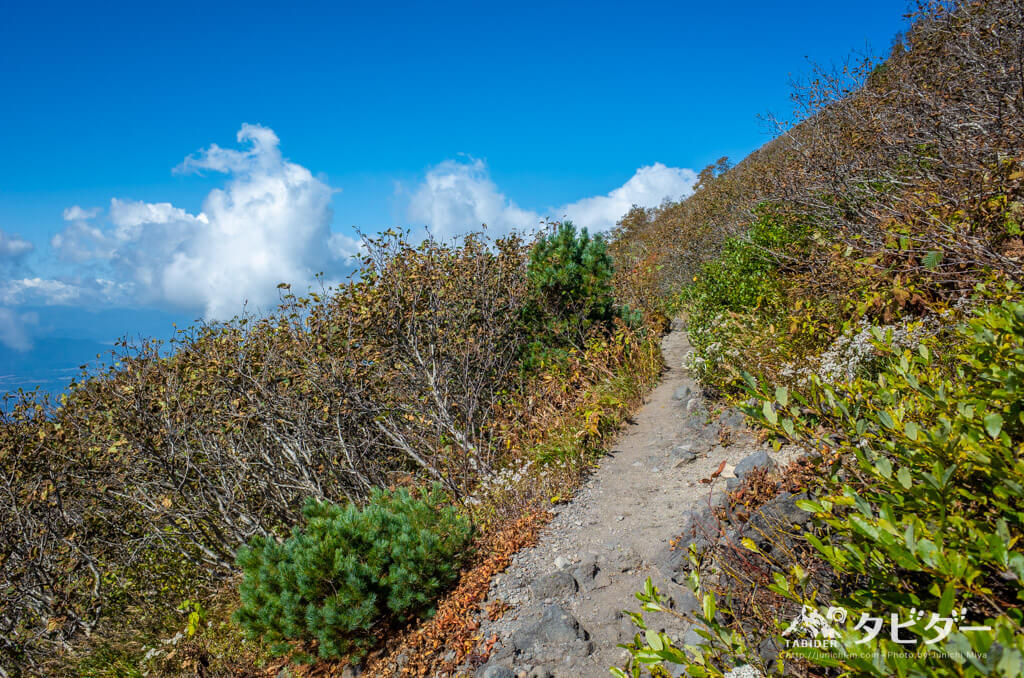 登山道に生えている草木を掴みながらすべらないように降りる。この草は非常に強く、ちょっと引っ張ったくらいでは全く抜けない。きっと他のハイカーも引っ張るだろうから、抜けまいと強く育ってきたのだろう。