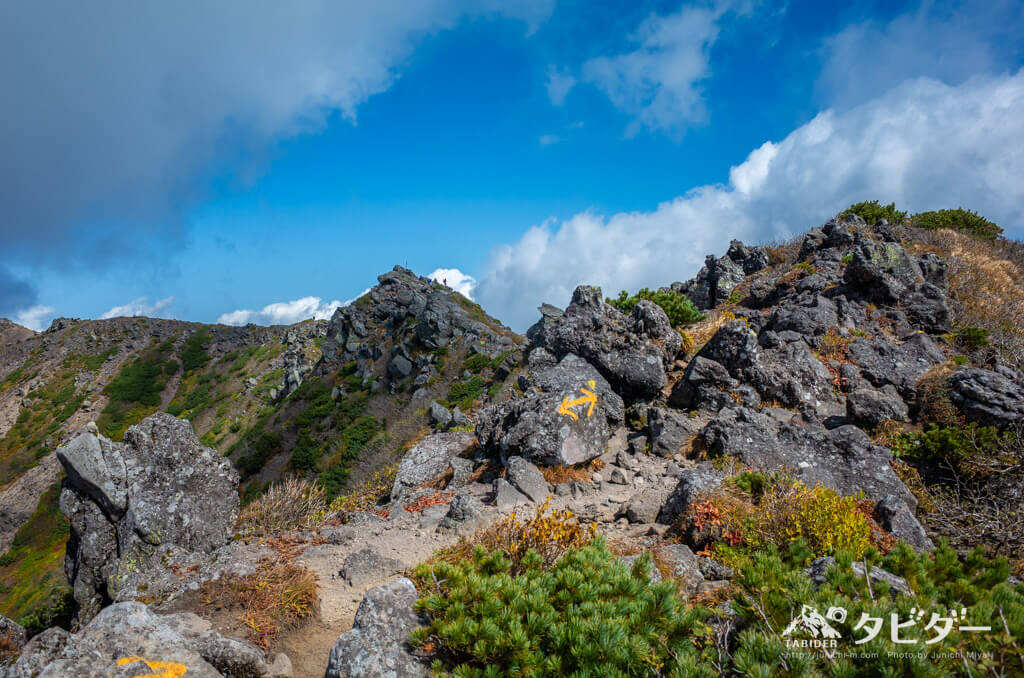 本当に一番高い頂きが山頂ポイントだった。ここからはほぼロッククライミング。黄色でマーキングされた○、→、×を目印に進む。全身を使って岩を乗り越えていく。