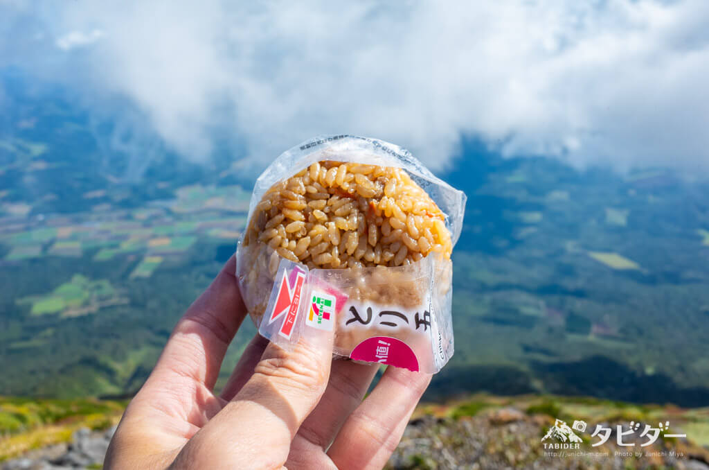 山頂では前日に買ってきたセブンイレブンのおにぎりを2つ(五目おにぎりと日高昆布)と納豆、ミニトマトにラスク、せんべいなど。ほぼ全部食べきった。